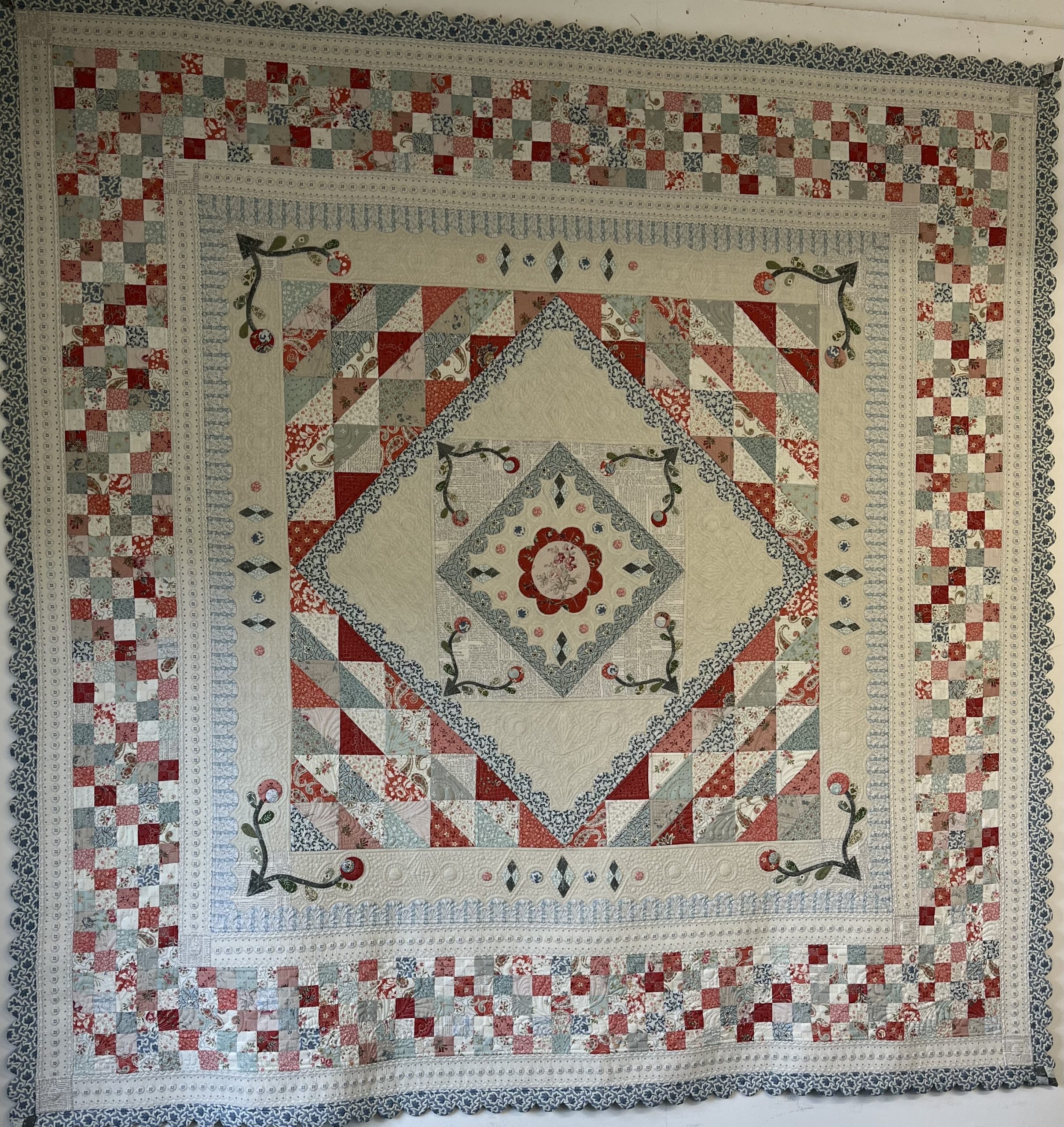 Quilting is putting the top quilt wadding and backing into a sandwich and holding it together either with machine or hand stitches.