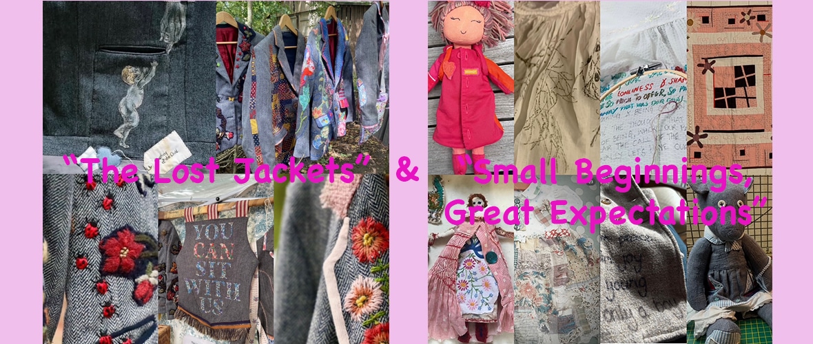 Curtains to Couture was created in October 2024 by 5 friends aiming to spread their message of sustainability and to “save the world, one curtain at a time” and in just over a year they have managed to gain a strong following of likeminded stitchers and creatives on Instagram. They are keen to involve others in collaborative stitching projects and bring 2 of these projects to Cowslip in April. “The Lost Jackets” (as featured in Embroidery magazine) – 11 unwanted, worn out school jackets donated to charity, yet heading to landfill due to their poor condition, were saved and reinvented by 11 textile artists. And “Small Beginnings, Great Expectations”, an exploration in stitch of memories and emotions sparked by a collection of much loved but no longer wanted precious baby and toddler clothes. Two very different thought provoking projects, both reflecting the creativity and skills of many likeminded women, and highlighting the importance of saving garments from landfill, reinventing them and thus giving them a new life.