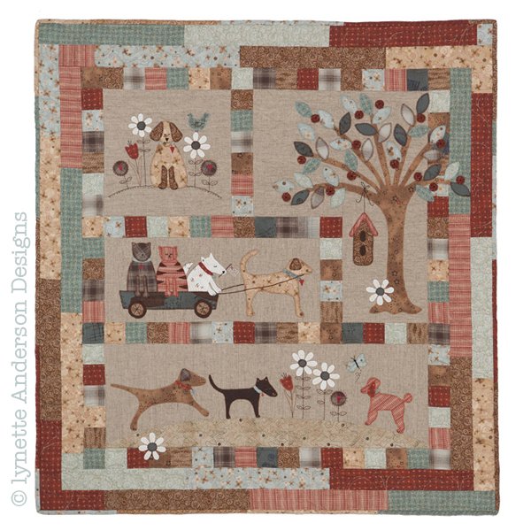 This fun quilt introduces some of Hugo’s new doggie friends. Jet (the black dog) belongs to one of my sons, Beau the brown Labrador belongs to my mum and dad and Rosie, a very much loved poodle from my past. I am so excited about how this quilt looks, designed with animal lovers in mind I have used subtle dirty colours which would also make it ideal for a boy. I have combined fusible appliqué, simple embroidery, piecing and of course some of my favourite yo-yo’s.